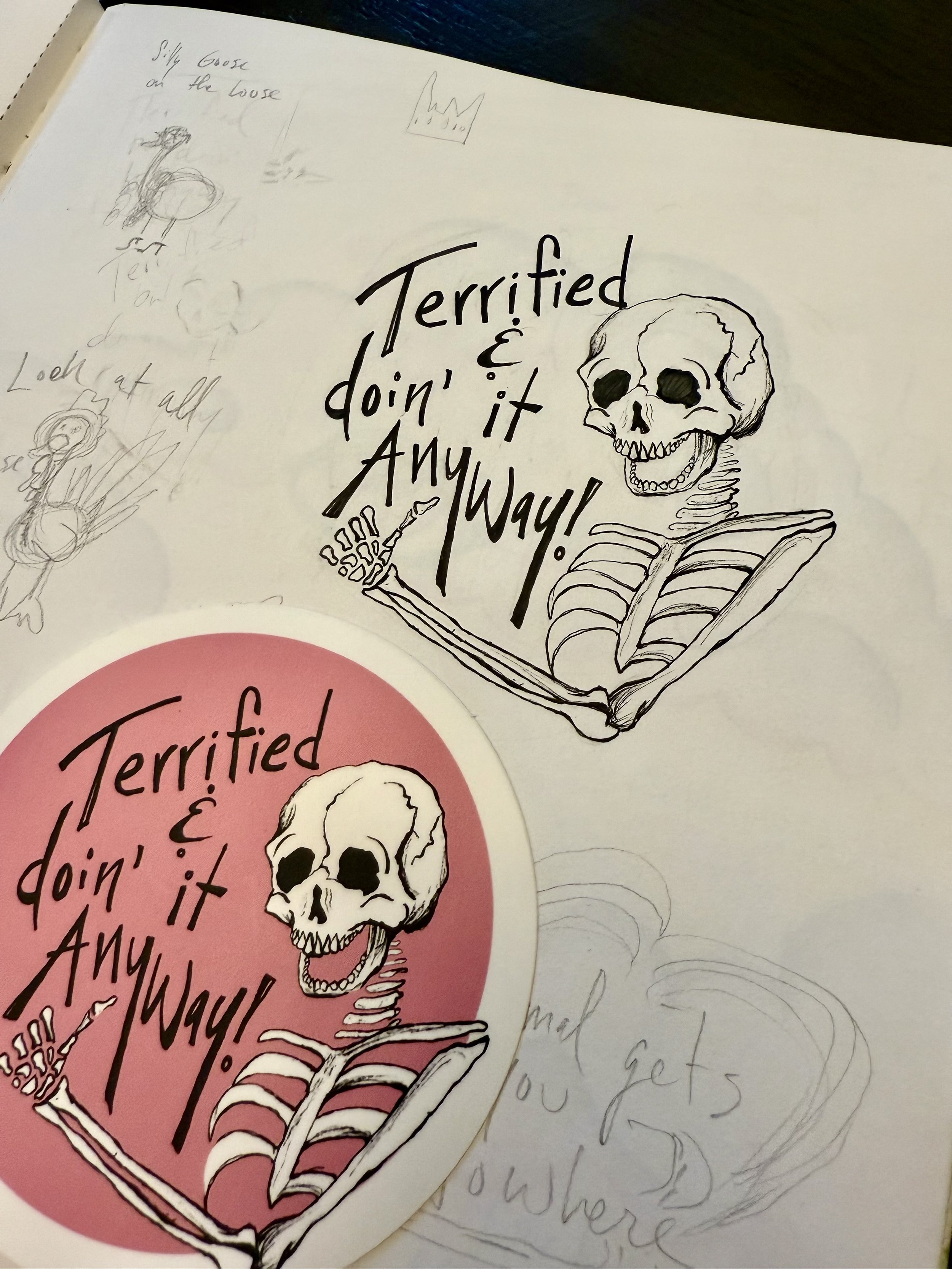 Some time ago, I found myself reflecting on all the scary things I’d been saying yes to. That moment of reflection turned into a drawing because that’s how I process things: through art. (Which then turned into a sticker, a mug, and a hoodie✨)